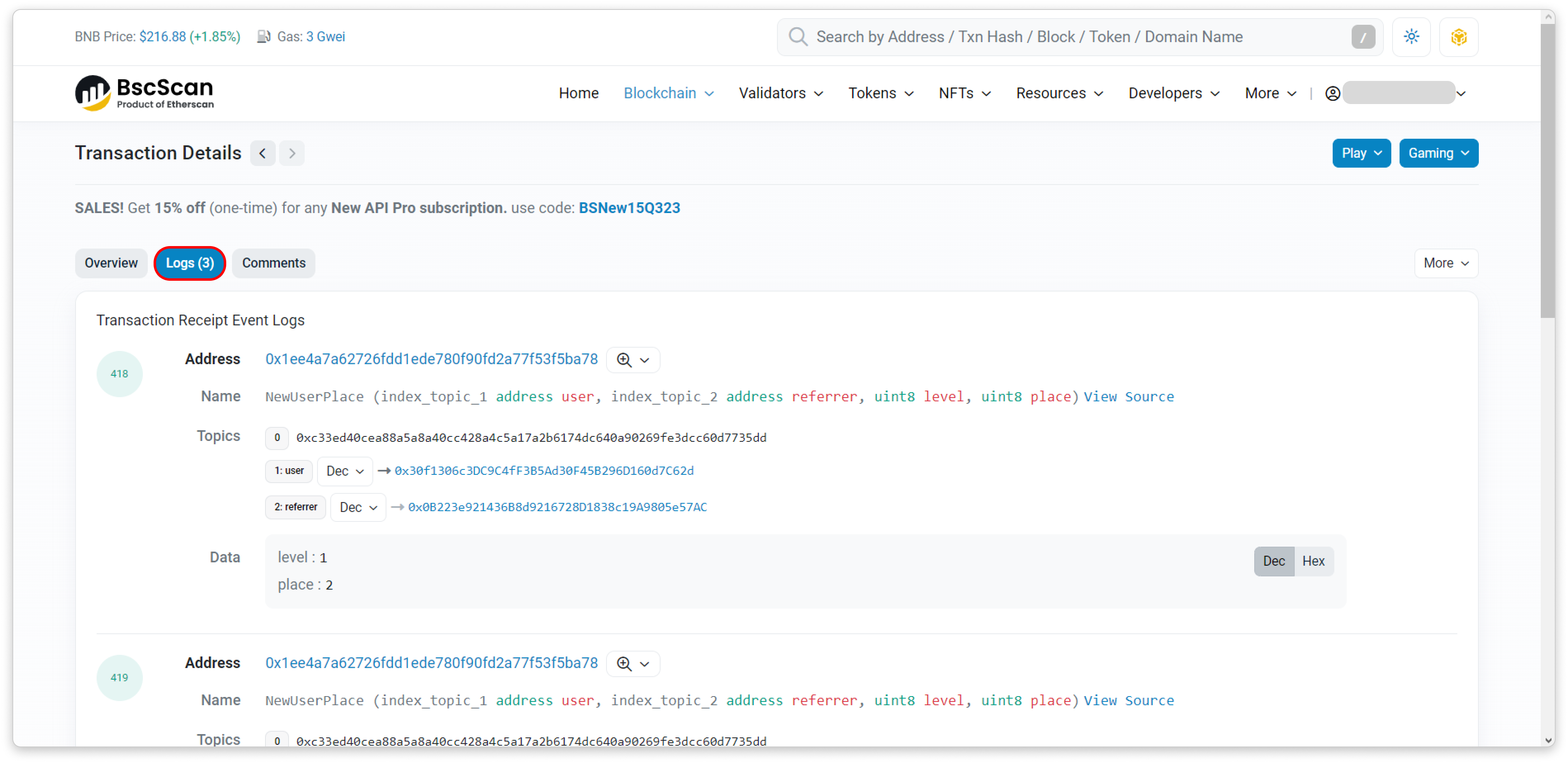 Access the Event Logs by going to the transaction details page, and select the Logs tab: